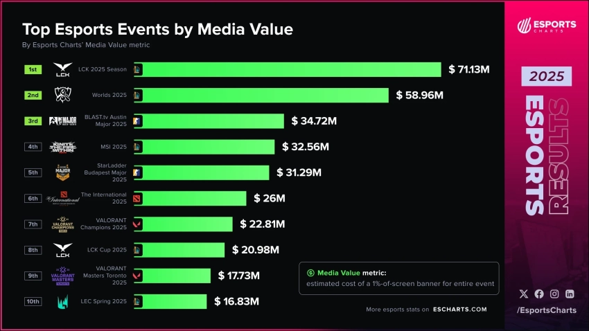 Источник: LCKАналитический портал Esports Charts опубликовал рейтинг киберспортивных событий 2025 года, основанный на показателе Media Value. Этот параметр оценивает потенциальную стоимость рекламных интеграций во время трансляций.