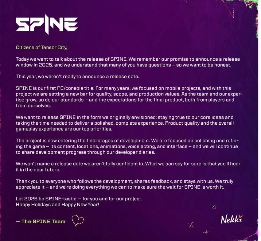 Авторы экшена Spine извинились за невыполненное обещание назвать дату релиза в 2025 году