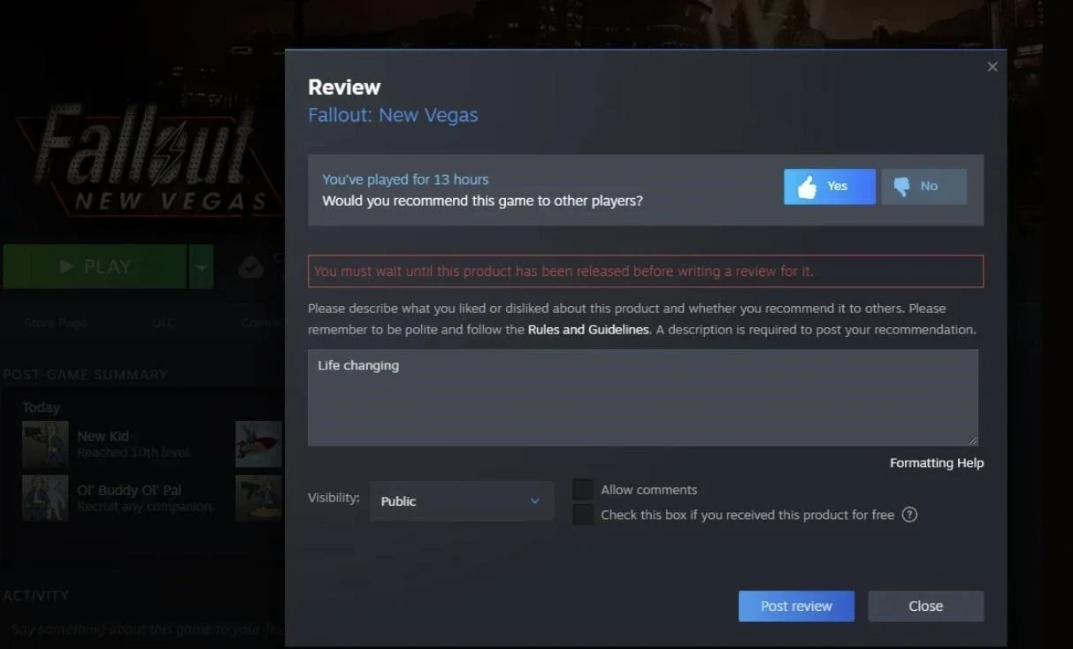 Обложка: скриншот Fallout: New VegasФанаты Fallout: New Vegas так долго и преданно ждут ремастер, что даже ошибка в Steam начинает казаться намёком. Геймер попытался оставить отзывы к игре, но столкнулся с системным сообщением. Оно призывало дождаться выхода продукта, прежде чем писать комментарий.
