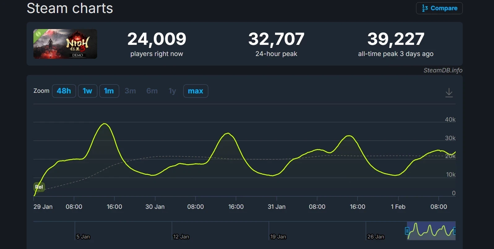 Обложка: скриншот Nioh 3Вышедшая в конце января демоверсия экшена Nioh 3 привлекла почти 40 тысяч игроков на пике онлайна в Steam. При этом игра продолжает интересовать аудиторию даже спустя несколько дней — в момент написания новости в ней находится более 24 тысяч пользователей.