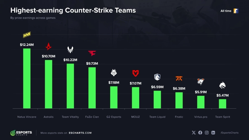 Первое место бессменно удерживает Natus Vincere с суммарным доходом в 12,24 млн долларов за более чем 16 лет на профессиональной сцене. На второй строчке расположилась Astralis с показателем 10,7 млн долларов.