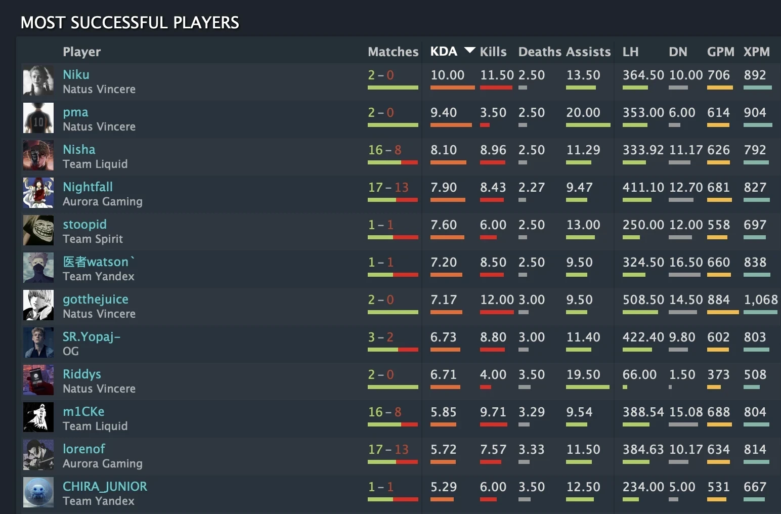 Вторую строчку уверенно забрал его тиммейт Юрий «pma» Проц с результатом 9.40 KDA и 20.00 ассистами в среднем за игру. А вот настоящую стабильность показал Michał «Nisha» Jankowski из Team Liquid. Он замкнул тройку лидеров с мощным показателем 8.10 KDA, при этом звездный поляк набил эту статистику за целых 24 сыгранные карты.