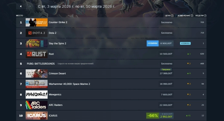 В российском сегменте Steam также не обошлось без Slay the Spire 2 — новинка заняла третье место, уступив лишь нерушимым мастодонтам в лице Counter-Strike 2 и Dota 2. Также отечественные игроки активно оформляют предзаказы Crimson Desert. А первую десятку закрыла ICARUS — выживалка поднялась на 61 позицию за счёт скидки в 66%.