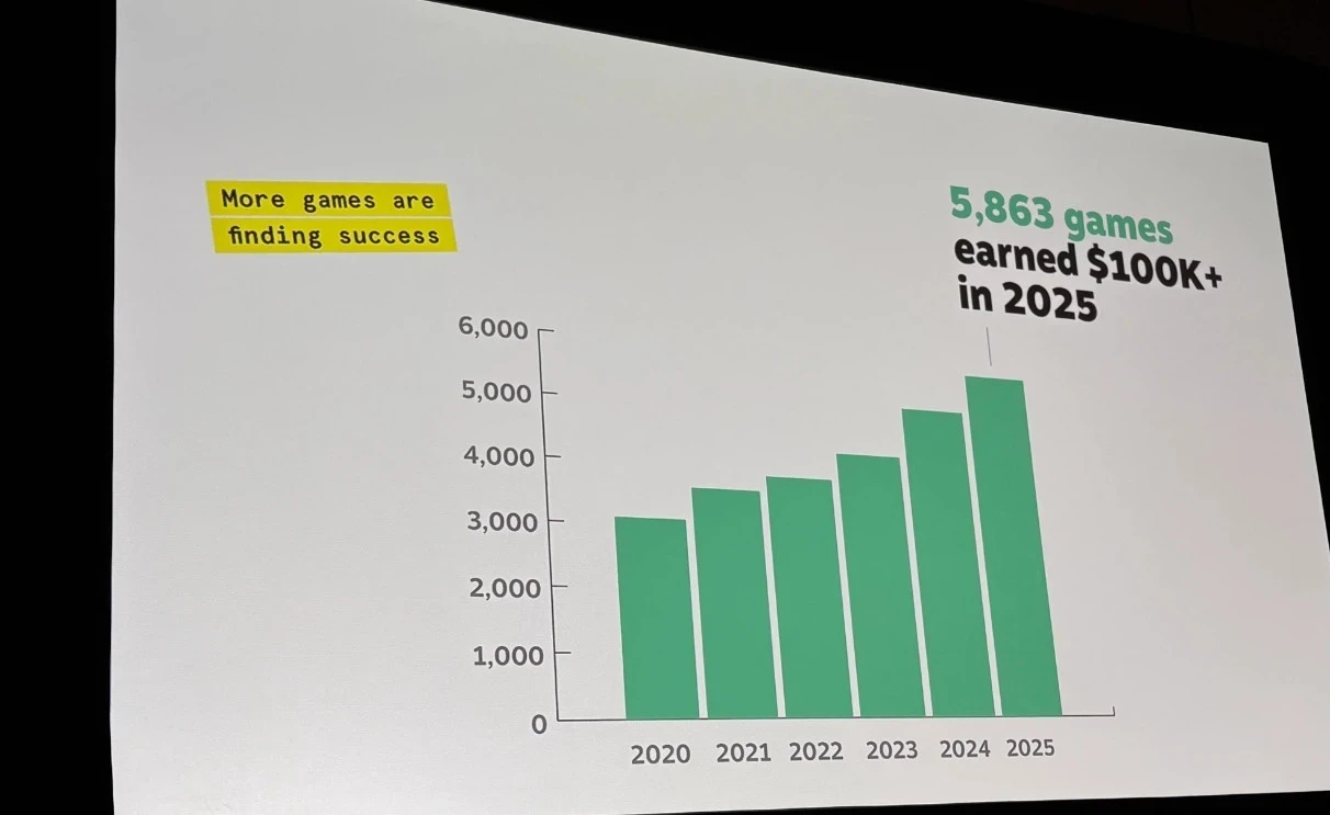 Что звучит крайне интересно, так это количество успешных игр с заработком свыше 100 тысяч долларов. В 2025 году такой выручки достигли 5863 игры — это больше, чем за все прошлые годы. Причём ежегодно показатель растёт, несмотря на опасения о перенасыщенности магазина.